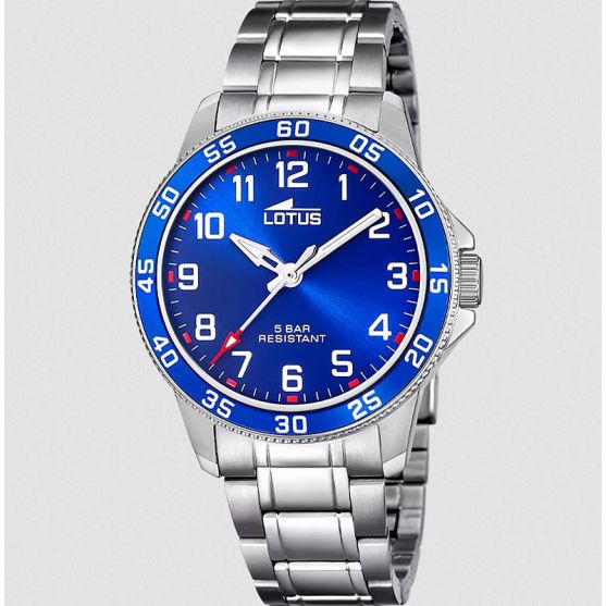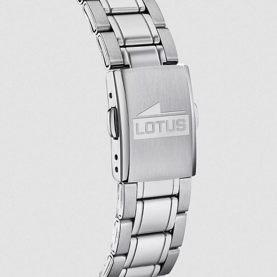 Cette montre enfant Lotus présente un cadran de 36 mm sur un bracelet acier.