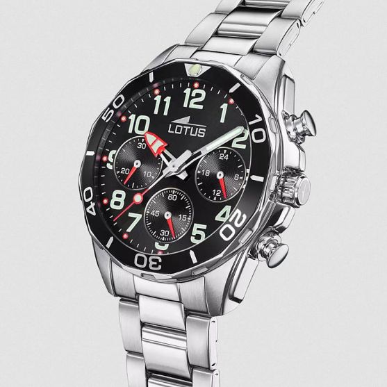 Cette montre enfant Lotus présente un cadran de 36 mm agrémenté d'un chrono sur un bracelet acier.