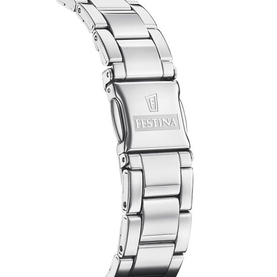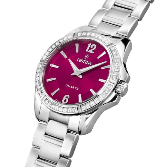 Cette montre Festina présente un boitier acier à la lunette entièrement strassée, d'un cadran framboise sur un bracelet acier.