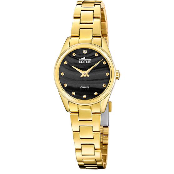 Ce coffret Lotus présente une élégante montre femme acier doré au cadran noir marbré ainsi qu'un bracelet bijou en acier doré.