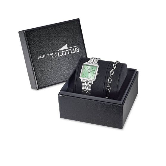 Ce coffret Lotus présente une élégante montre femme acier au cadran vert pastel ainsi qu'un bracelet bijou en acier.