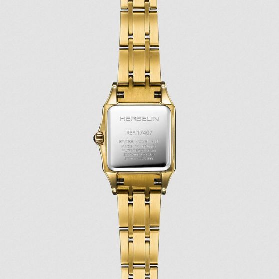 Montre femme Michel Herbelin 17407BP1N08. La montre femme Mini Luna de la maison Michel Herbelin présente un boîtier rectangulaire acier doré sur un élégant bracelet acier doré également.