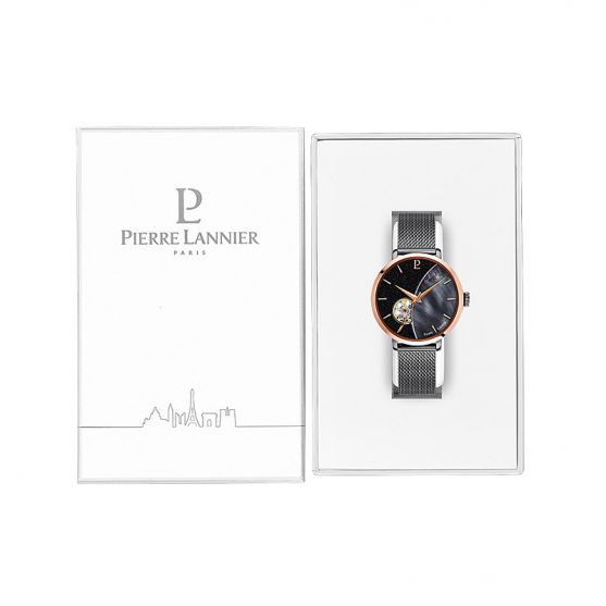 Cette montre femme automatique Céleste Pierre Lannier présente un cadran à coeur ouvert sur le mouvement automatique, dans un boîtier acier sur un bracelet milanais en acier anodisé.