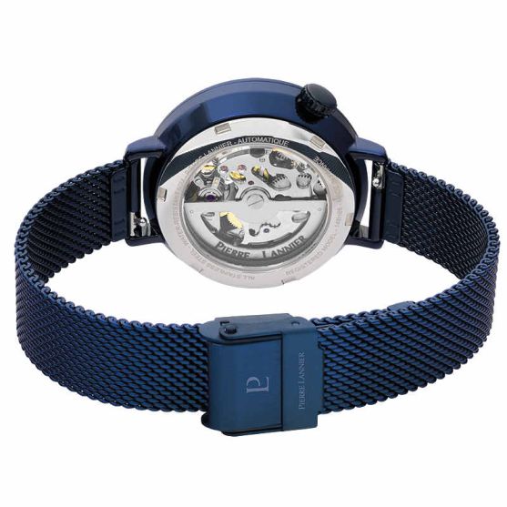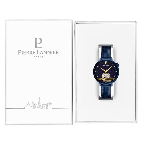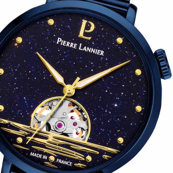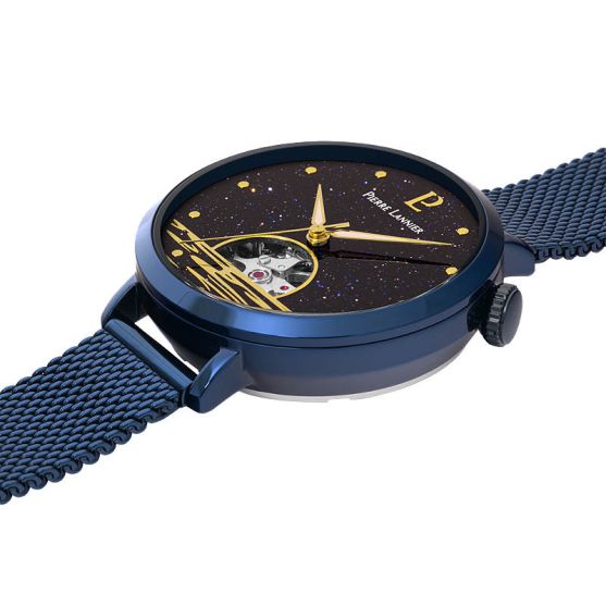 Cette montre automatique femme Pierre Lannier Australe 148H866, offre un cadran cœur ouvert qui laisse entrevoir un mouvement évoquant le reflet du soleil sur l'eau. Son cadran bleu nuit rappelle le scintillement des étoiles dans la voute céleste nocturne.