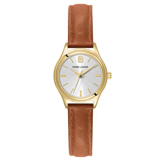 Montre femme Pierre Lannier. Cette montre Pierre Lannier collection Pya présente un boîtier doré sur un bracelet cuir marron.