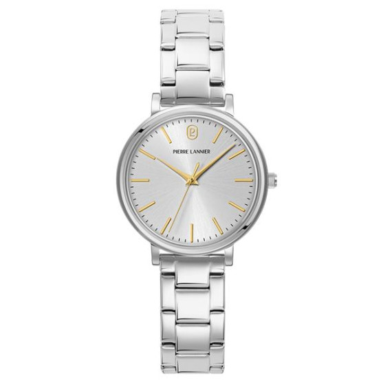Cette montre Pierre Lannier collection Essential 087M621, présente un cadran argenté aux index dorés, au boîtier acier sur un bracelet acier également.