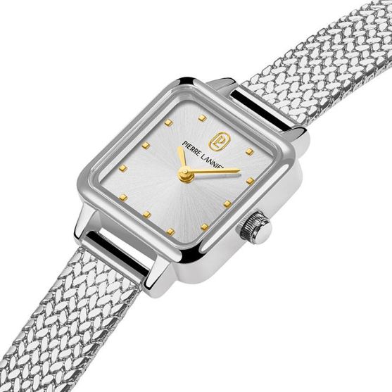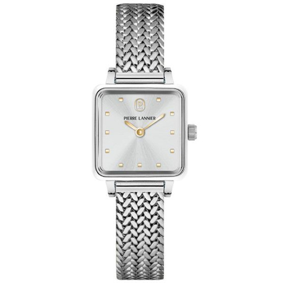 Montre femme Pierre Lannier à l'élégance intemporelle, inspirée du raffinement des galeries parisiennes. Son cadran carré de 20 mm, à la finition argenté lumineuse, capte délicatement la lumière et met en valeur des index fins ainsi que des aiguilles dorées, pour une lecture tout en subtilité.
