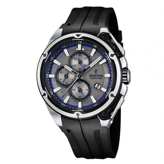 Montre homme Festina Chrono Bike. Cette montre Festina Chrono Bike au design inspiré du cyclisme présente un cadran gris et bleu alliant élégance et sportivité, chronographe et dateur en font une montre indispensable.