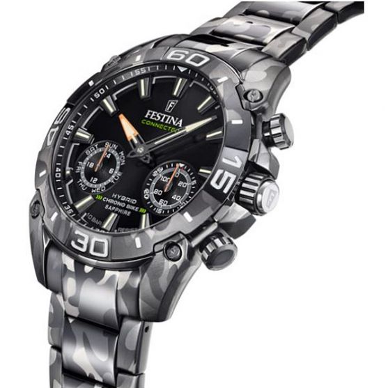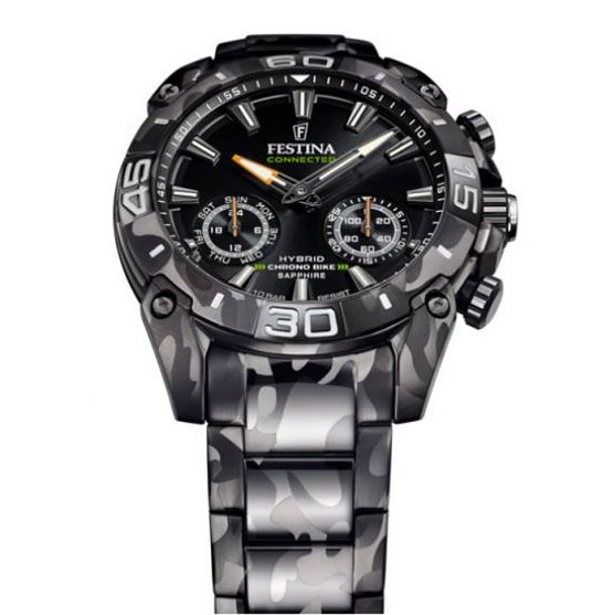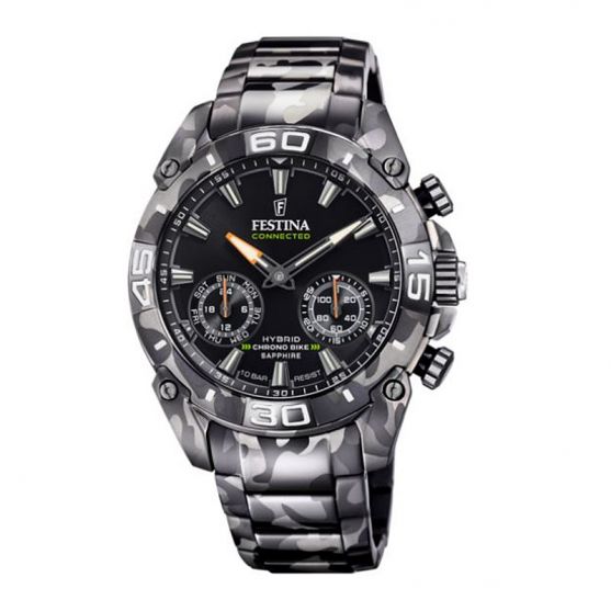Cette montre homme Festina Connectée Chrono Bike étanche à 10 ATM présente un cadran noir agrémenté d'un chronographe, d'un tachymètre, de l'affichage du jour et d'une trotteuse sur un bracelet acier aspect camouflage.