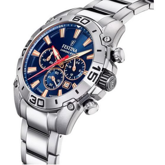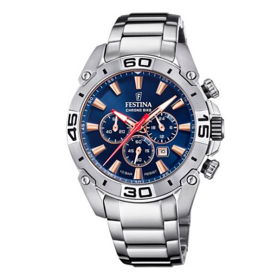 Cette montre homme Festina Chrono Bike étanche à 10 ATM présente un cadran bleu et rose agrémenté d'un chronographe, d'un tachymètre, de l'affichage d'un dateur et d'une trotteuse sur un bracelet acier poli et brossé. Sportive et élégante cette montre Festina habillera votre poignet en toutes circonstances.