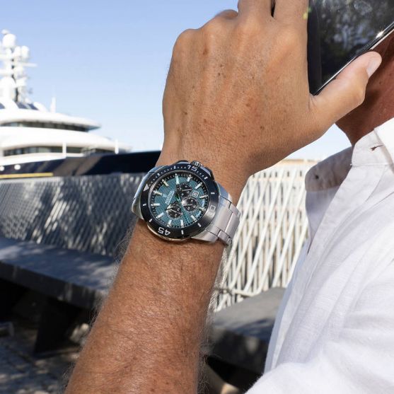 Cette montre homme Festina Chrono Bike étanche à 10 ATM présente un cadran bleu-vert agrémenté d'un chronographe, de l'affichage d'un dateur et d'une trotteuse sur un bracelet acier poli et brossé.