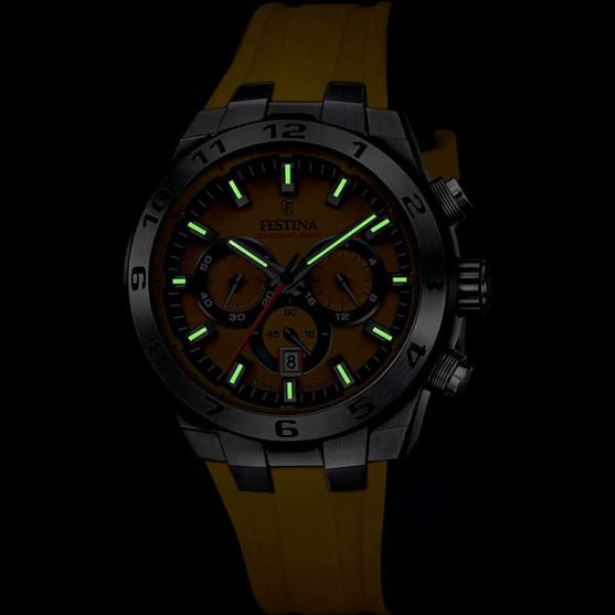 La montre Festina Chrono Bike référence F20671/4 capture l'esprit du cyclisme avec son cadran jaune et bleu, évoquant les routes ensoleillées et les ciels infinis des étapes légendaires de la Grande Boucle.