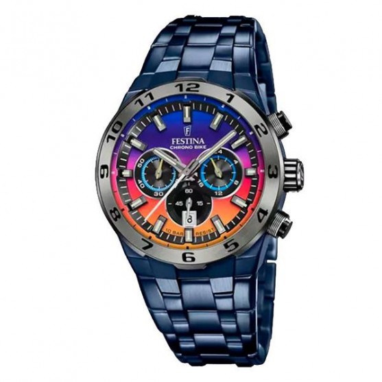 Ce coffret Chrono Bike présente une montre au cadran multicolore sur un élégant bracelet acier bleu.
