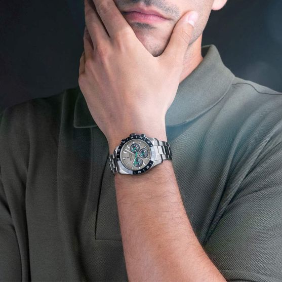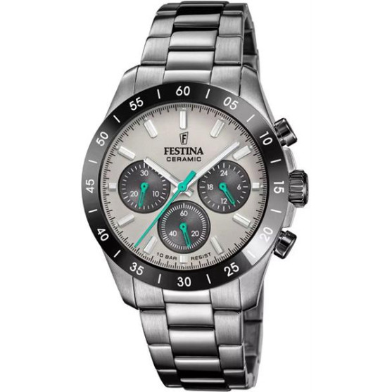 Cette montre homme Festina étanche à 10 ATM présente un cadran orné d'une lunette en céramique noire également agrémenté d'un chronographe, de l'affichage d'un dateur et d'une trotteuse sur un bracelet acier gris anthracite.