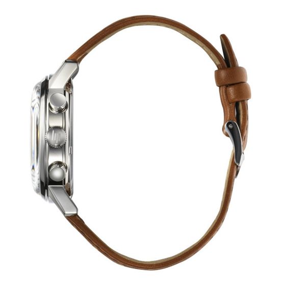 Le boitier en acier présente une finition élégante et robuste, accompagnée de deux poussoirs polis pour actionner le chronographe. Le tout est monté sur un bracelet cuir brun perforé, référence directe aux gants de pilote et aux volants racing.