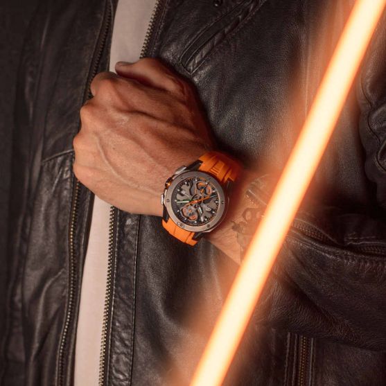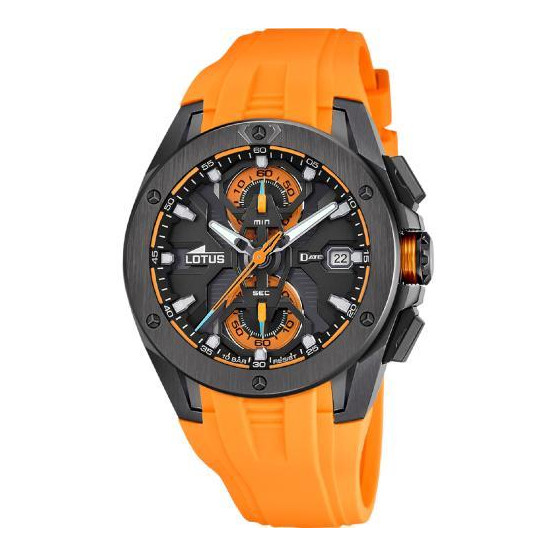 Cette montre homme Lotus 18943/3 collection Vortex présente un cadran orange équipé d'un chrono et d'un dateur sur un bracelet silicone orange.