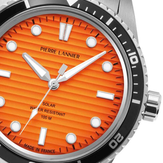 Son cadran orange orné de reliefs horizontaux, capte la lumière pour alimenter son mouvement, vous offrant une autonomie prolongée sans changement de pile.