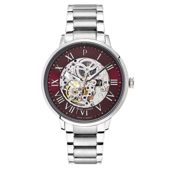 Montre homme automatique Pierre Lannier au design raffiné, elle séduit par son cadran au contour bordeaux profond qui encadre élégamment un coeur ouvert. Cette ouverture dévoile le ballet précis des rouages, offrant un spectacle mécanique fascinant à chaque instant.
